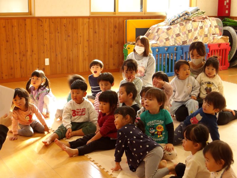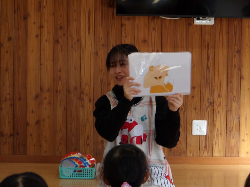 保育士の出し物は「秋のかくれんぼ」のエプロンシアターでした。秋の葉っぱや木の実の後ろに隠れた動物たちをみんなで探していました。動物を見つけると「○○がいたよ!」と大喜びしていました。
